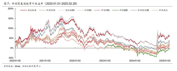 截至2025.02.28,创业板指、创业板50、科创综指、科创50、科创100、科创200、科创创业50、科创成长的PE-TTM分别为33.54倍、31.77倍、174.63倍、113.52倍、215.46倍、283.76倍、41.10倍、83.77倍,PB分别为4.17倍、4.65倍、4.06倍、4.92倍、4.39倍、3.26倍、4.95倍、7.44倍。创业板指、创业板50、科创创业50的PE近5年百分位处于低位,而科创综指、科创50、科创200处于高位。科创成长的PS最高,为9.95倍;创业板指的PS近5年百分位较小,为33.24%。