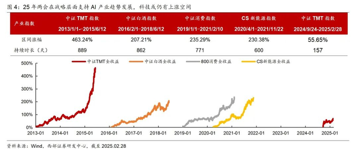 2024年9月24日以来(截至2025.02.28),这一轮科技上涨行情的直接推手是AI产业趋势的变革。回溯历史上典型的产业周期带来的行情,如2013年初-2015年中移动互联网浪潮、2016年初-2018年中供给侧改革叠加外资流入下的大蓝筹、2019年初-2021年初经济复苏下的消费、2020年中-2021年末的新能源革命,当前演绎的时间或空间都尚未到达极致,预计科技仍有向上空间,或成为全年主线行情。