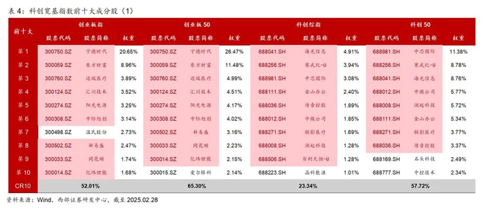 从前十大成分股来看,1)因创业板在深交所、科创板在上交所,因而股票上市交易所不同,差异较大。而科创创业50有6只成分股与创业板50重合、4只成分股与科创50重合;2)创业板指、创业板50的前十大成分股重合度较高,有9只股票相同,且前6大成分股完全一样,分别为宁德时代、东方财富、迈瑞医疗、汇川技术、阳光电源、中际旭创;3)科创综指、科创50前十大成分股中有8只重合,科创100、科创200、科创成长成分股与其他指数差异较大;4)从前十大成分股集中度来看,创业板50集中度最高,为65.30%,第一大成分股宁德时代权重较高,达26.47%。科创综指、科创100、科创200成分股分布相对较分散,前十大成分股集中度分别为23.34%、24.35%、14.69%,单只成分股权重均不超过5%。
