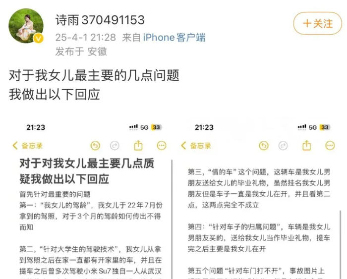 据悉,王女士的女儿是小米SU7的驾驶人,事故发生后,王女士曾在微博上发帖描述了事发大概经过,还表示从事件发生到当时,小米方面从来没有人联系过他们,也没有来过一个慰问电话。4月1日晚9点多,王女士又专门在微博上发帖回应质疑。