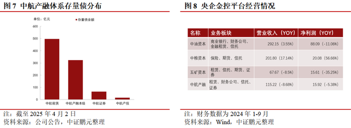 国务院对央企债券违约风险防控要求明确,管理层推进债券平稳落地意愿强;中航产融同中航工业联系紧密,中航工业近年给予的支持包括但不限于股东借款、承接资产转让、进行异议股东补偿助力终止上市方案推进等。中证鹏元认为若中航产融公开债转场外兑付承压,中航工业给与流动性支持可期。根据国务院国资委《中央企业债券发行管理办法》(国资发产权规〔2023〕34号)中对中央企业债券违约风险防控有明确要求,央企违约对主要管理人员带来的事后处置及解释压力极大,管理层及责任人推进公开债有序落地、不发生违约的意愿强。截至2025年4月2日,公司公告的拟与公司债券及债务融资工具持有人达成协议并转场外有序兑付的安排(以下简称“安排”),安排涉及的存量境内公开债22只,规模272.7亿元,2025年年内集中到期规模106亿元,整体资金规模相较于中航产融本部现金类资产(截至2024年9月末230亿元)、中航财务吸收存款(截至2024年末1,956亿元)规模并不大。截至2025年3月28日中航工业及其下属单位合计持有公司51.02%的股权,经营及管理层来自中航工业部室,相较于独立开展业务的子公司,中航产融同中航工业联系紧密。本次终止上市方案得到了中航工业对于异议股东补偿(不超过152.36亿元),有助于中小股东表决结果通过。中证鹏元认为若中航产融公开债转场外兑付承压,中航工业给与流动性支持可期。