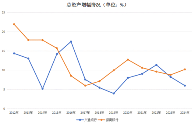 2024年末,交通银行总资产14.9万亿元,同比增长5.98%;招行总资产12.15万亿元,增速10.19%。