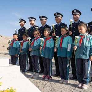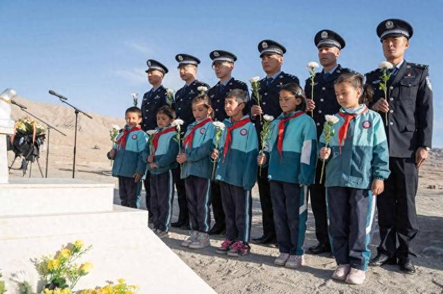 在时代楷模拉齐尼·巴依卡烈士陵墓前,民警带领学生们一起为英雄拉齐尼·巴依卡擦拭墓碑的尘土,向英烈鞠躬默哀、献花敬礼,表达无尽的追思和敬意。祭奠仪式后,民警们现场为学生们宣讲英雄拉齐尼·巴依卡一家三代戍边英雄事迹,为驻地学生上了一堂深刻的红色教育党课。