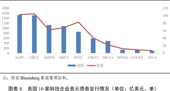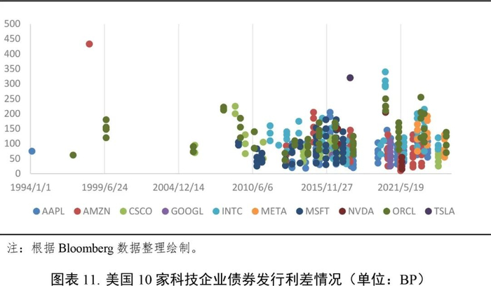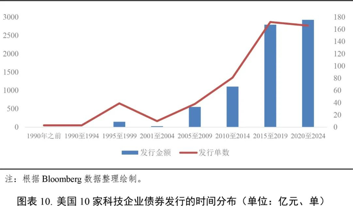 为研究美国科技企业债券融资历史,我们选取了10家科技企业,包括:特斯拉(“TSLA”)、甲骨文(“ORCL”)、英伟达(“NVDA”)、微软(“MSFT”)、元(“META”,原名脸书)、英特尔(“INTC”)、谷歌(“GOOGL”)、思科(“CSCO”)、亚马逊(“AMZN”)和苹果(“AAPL”)。据统计,从1980年至2024年末,上述10家公司共发行债券512只,共融资约7,562亿美元。部分企业在发展初期曾通过发行高收益债券筹集,但截至2024年末,大部分已经发展成为投资级企业,其债券融资基本没有了高收益债券特征。