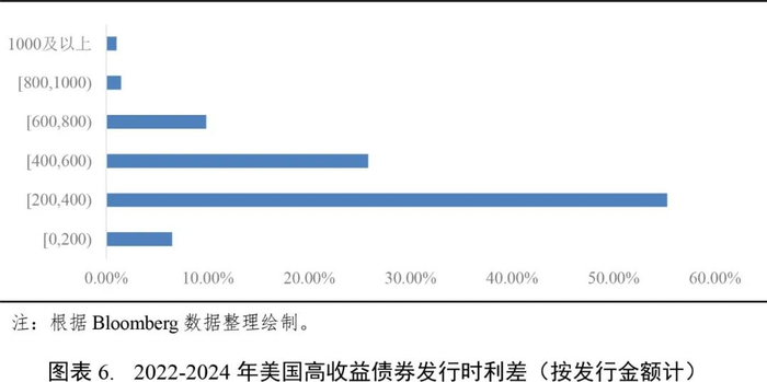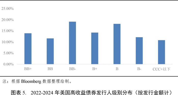 高收益债券的发行主体通常存在较高的违约风险,其财务状况、行业前景或经营稳定性较弱,导致信用评级机构对其偿债能力持谨慎态度,信用评级一般都在BB+及以下。2022-2024年,美国高收益债券发行人的信用评级分布较为分散,其中BB-和B的发行人较多。在发行利差方面,大部分高收益债券的发行利差在200-400BP之间,少数甚至达到1000BP以上。
