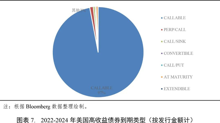 2022-2024年,美国的高收益债券发行人主要分布在非必需消费品、能源、金融服务、工业、通信、材料和科技等行业。非必需消费品占比最高,主要涉及零售、汽车、酒店等细分领域。通信主要涉及电信、媒体和互联网服务行业,这些企业通过高收益债券融资支持技术升级和业务扩张。