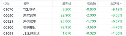 家电股跌幅居前,TCL电子跌超9%,海尔智家跌超8%,海信家电跌超6%,美的集团跌超4%。