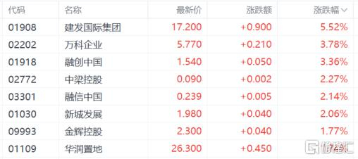 内房股上涨,建发国际集团涨超5%,万科企业、融创中国涨超3%,中梁控股、融信中国等跟涨。天风证券表示,房地产行业基本面拐点或将近,增量政策预期持续。交易端,市场“底部共识”增强,“短线政策博弈+中长期估值修复”逻辑更加顺畅。配置方向上。