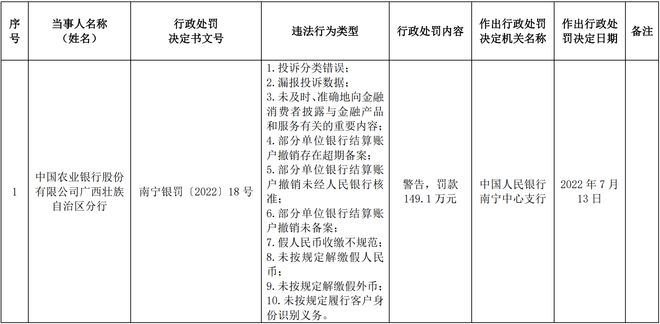 值得一提的是,2022年7月,农行广西分行曾收到149.1万的罚单,处罚理由就包括投诉分类错误,漏报投诉数据,未及时、准确地向金融消费者披露与金融产品和服务有关的重要内容等。
