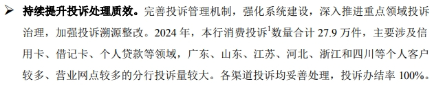 该行年报披露,2024年,收到消费投诉数量合计27.9万件,主要涉及信用卡、借记卡、个人贷款等领域,广东、山东、江苏、河北、浙江和四川等个人客户较多、营业网点较多的分行投诉量较大。各渠道投诉均妥善处理,投诉办结率100%。