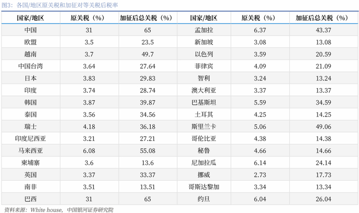 中国面对的关税:特朗普上任前的平均关税11%+所谓芬太尼问题的20%+对等关税34%,总计约65%。本次对等关税强调是额外征收(in addition to),因此关税结果体现的是叠加。