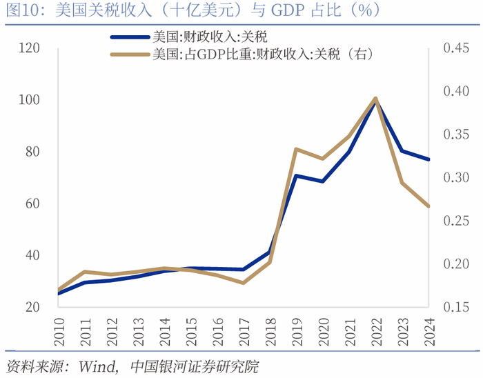 具体到关税,“协议”框架下加征关税或有三重预期目的:一是补充财政收入,减轻赤字压力,从而改善国民福祉与为减税融资。理论上,关税通过压低进口商品议价能力,对国内厂商形成利好,关税收入可作为财政资金用于国内减税或公共支出,为国内减税融资。而对于国际厂商的损失而言,其本质就是单边加税的损失转嫁。二是推动制造业回流与产业链重构。就现行加征关税节奏来看,关税聚焦高科技产业与关键原材料行业的回流和本土化目标,而1.0时期特朗普政策从一定程度上确实推动了制造业回流美国本土。三是增大战略谈判筹码。由于美国市场对全球出口的依赖度相对较低,其关税政策对其他国家出口的抑制效应强于对本土消费的冲击,这种结构性差异使关税成为施压他国让步的战略工具。例如,通过威胁提高关税,美迫使各国“站队”并接受汇率协调方案和美债长期化置换,这与“海湖庄园协议”中重构国际规则的目标形成呼应。