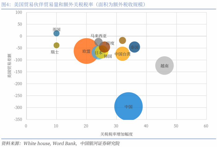 加征税率:全球普遍加征10%,贸易逆差越多的国家加征更多。特朗普演讲中提到的逻辑是——加征外国官方对美国产品征收综合税率的一半,但这个所谓的综合税率除了关税以外,还包括增值税、非关税壁垒(补贴、监管)、汇率操控等任何美国单方面认为的不公平行为。从实际加征情况来看,美国公布的“综合税率”约等于美国对某国的贸易逆差占美国对该国进口的比重,看似是一次精心调查之后的“对等”加征,实则是为了加征而加征的粗放处理。
