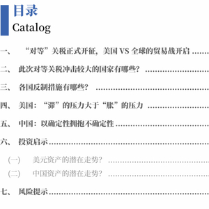 对中国经济和政策的影响:初步测算,美国合计超过50%的关税加征对中国GDP的影响约为1.0~1.5个百分点。今年中国已对扩大内需做了前瞻布局,但鉴于美国加征幅度超预期,我们认为4月政治局会议加码内需的概率进一步提高。目前已宣布尚未完全落地的逆周期政策包括育儿补贴、加力实施城中村改造等,未来的储备工具还包括“两新”“两重”扩围扩容、服务消费补贴、加大商品房收储力度等。