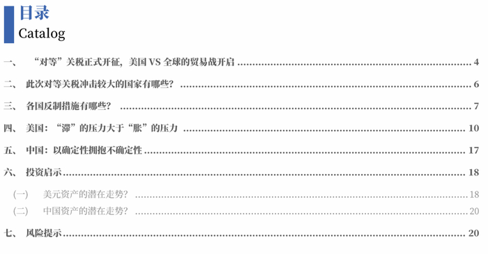 对美国经济与资产的影响:粗放加征关税将导致美国经济面临滞胀压力,总的来说,我们认为,“滞”的压力大于“胀”的压力。关税落地对于美国GDP的冲击约为1.6个百分点,美国下半年陷入衰退的概率进一步加大。加征关税对于美国CPI也会造成一次性冲击,但总需求下降也会形成一定通缩效应,“胀”的压力不足以影响美联储的降息步伐。美股将在“加征-反制”、经济衰退、通胀反弹等不确定性因素的阴霾下持续调整,直至货币政策转向宽松、国内减税等刺激政策落地,下半年的机会优于上半年。固收方面,短期“胀”,长期“滞”,10年期美债有下行空间,年内低点有望达到3.7%。