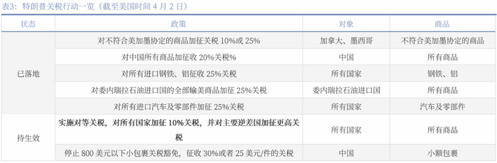 由点到面,对等关税标志着美国关税进入下一阶段。2月以来,特朗普关税政策分三阶段推进:第一阶段是针对中国、墨西哥、加拿大实施10-25%试探性关税;第二阶段则扩展至欧盟、日韩等盟友,但通过“一国一议”保留豁免空间,同时对关键商品领域(钢、铝、铜、木材)施加关税威胁;第三阶段是在与其他国家反复博弈制衡下,关税政策的“落地变形”。对等关税落地前,对加拿大墨西哥的第一轮关税、对中国的20%关税以及钢铁、铝关税已经落地。而美国时间4月2日对等关税落地后,基于美加墨协定的关税妥协继续生效,但对汽车和委内瑞拉石油进口国的关税也将伴随对等关税集中落地。美国关税将不再局限于个别对象、个别商品领域,而是进入“地毯式”关税覆盖的全新阶段。因此,对等关税并不意味着实质对等,而是大规模加征关税的幌子。
