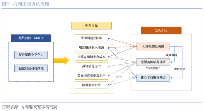 “海湖庄园协议”框架或为解读特朗普关税政策的重要视角。为巩固美元霸权、“让美国再次伟大”,重塑全球贸易、金融、安全体系,实现再工业化和制造业振兴,“海湖庄园协议”的构想浮出水面。目前,海湖庄园协议尚未被白宫承认,且执行起来难度极大,但特朗普就任以来,前期展现出来的执政思路与海湖庄园协议的核心思想十分契合。具体来说,海湖庄园协议涉及的手段主要涉及三个方向:其一是大规模加征关税;其二是建立主权财富基金,基金收入可以作为财政收入的重要补充;其三是设计“世纪债券”重塑美国债务体系,在实现美元贬值的同时,迫使别国配合美国调整其债务结构,将短期美债置换为超长期的世纪债券。