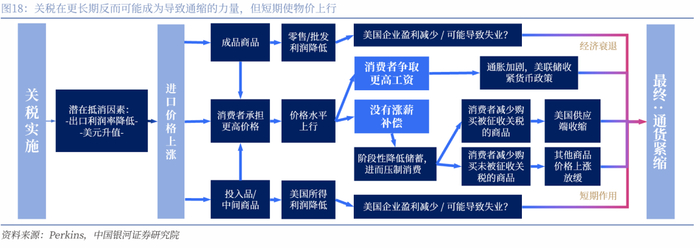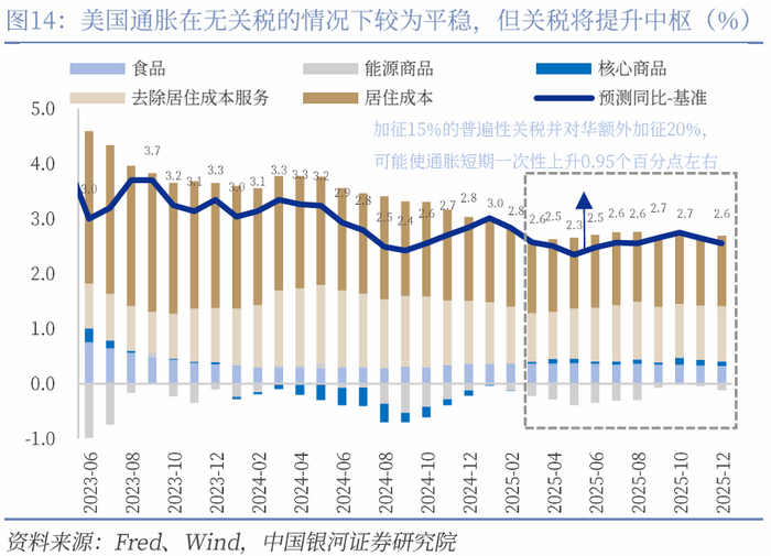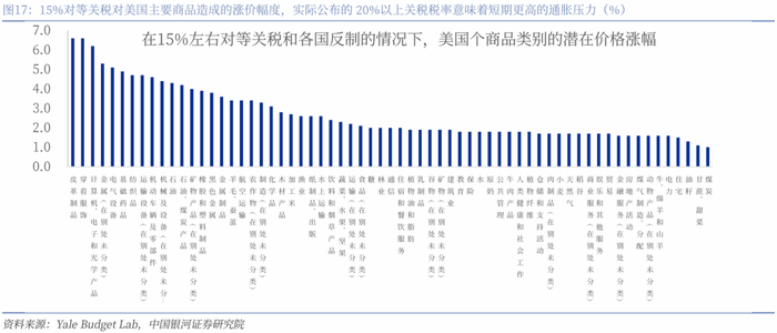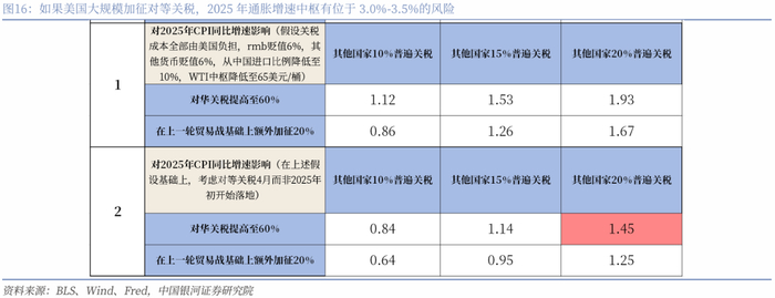 关税对通胀的冲击可能呈现短期通胀,但长期通缩的状态。我们预计美国对外关税税率上升至15%和20%以上的上限冲击分别对应着CPI同比增速在2025年2.5%的基准上抬升1.14和1.45个百分点。不过,考虑到关税为一次性冲击,以及其造成的美国总需求下行,2025年全年平均CPI增速仍难以明显高于3.0%-3.5%的范围,且经济下行风险下2026年CPI中枢可能因为经济下行从2.5%-3.0%的范围降低至2.0%-2.5%左右。我们的情景分析对应着基准(综合关税税率升至15%)和超预期(20%)的情形,虽然特朗普政府开始公布的关税税率偏高(及时不考虑汽车、铝钢和其他潜在关税叠加,综合税率可能也已经升至20%上方),但在沟通后依然有望出现一定程度的降低。其他可参考的测算包括:(1)耶鲁预算实验室的模型显示,在15%左右综合关税税率之下,PCE通胀可能上升1.7%(各国反制则可能上升2.1%);(2)2018年美联储蓝皮书测算认为15%的非能源普遍性关税大约对应1.25个百分点的PCE通胀抬升;(3)波士顿联储利用投入产出表测算对华加征10%,对加拿大和墨西哥加征25%的情况对应着PCE通胀中枢上行0.5到0.8个百分点(而相比之下2018年的关税仅为0.1到0.2个百分点);如果以此类推,那么15%的综合关税税率对应约1.25到2个百分点。虽然这些估算可能均为偏上限的估计,但毋庸置疑的是大规模普遍性关税在短期将伴随着一次性的通胀抬升。