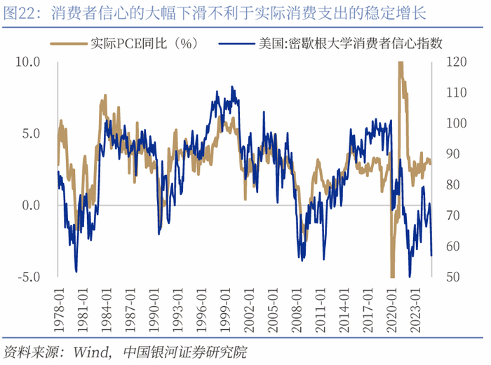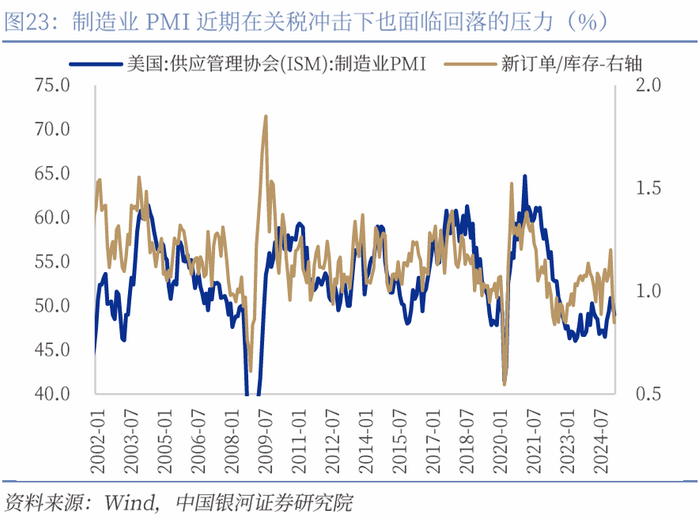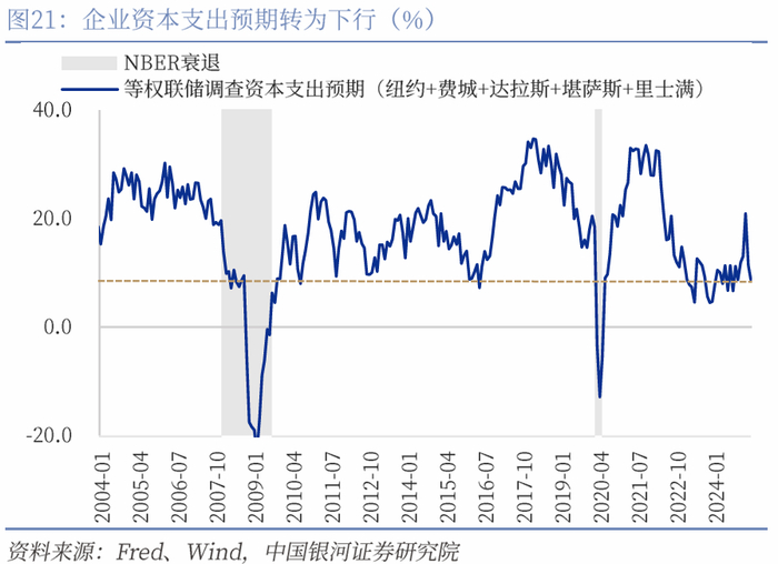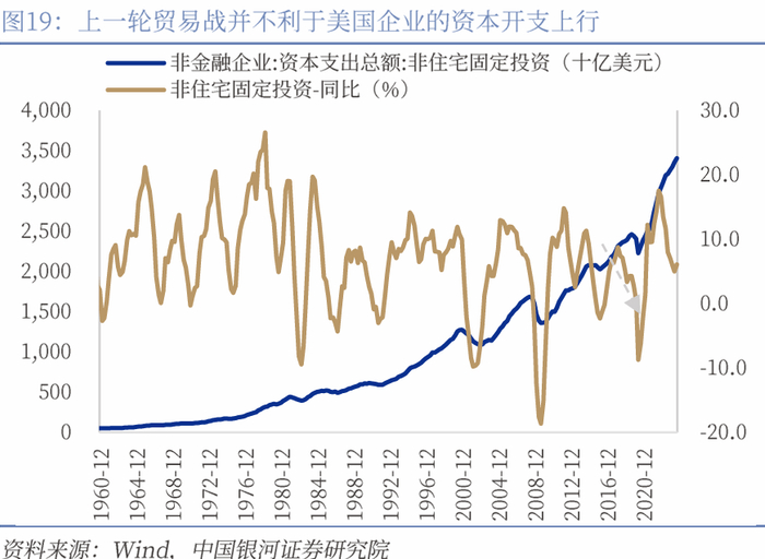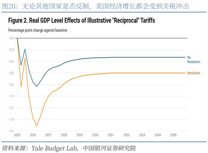 从特朗普上一轮贸易战的效果来看,叠加美联储的紧缩周期,企业名义非住宅资本开支的增长斜率有所放缓,同比增速从7%以上逐步下行至4%,制造业占GDP比例2018年在11%左右没有变化,2019年在经济压力下继续下滑。经济顾问委员会(CEA)的相关研究认为特朗普的上一轮贸易战每年可能拖累GDP约0.4%;而包括税务基金会和国际货币基金组织等在内的众多机构估算10%至20%的普遍性关税对经济的拖累至少在0.5%左右,严重情况下可能导致经济较基准增速下行1.7%。耶鲁预算实验室对“对等关税”(综合税率约15%)情况下的GDP冲击测算显示2025年总产出将走弱0.6到1个百分点。总而言之,关税和其他国家的反制下,不仅外部对美国产品和服务需求短期走弱,内部的消费能力和企业资本开支亦面临降低的压力,这也是近期市场对美国经济陷入滞胀或是温和衰退担忧加大的重要原因。