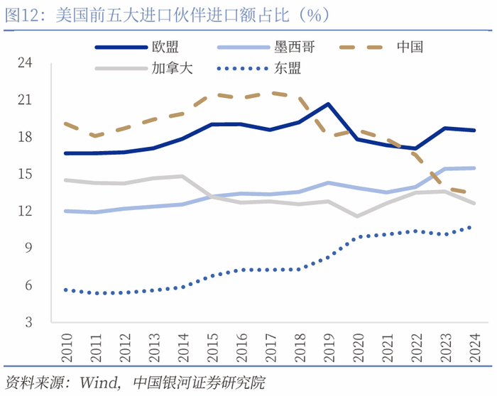 一是战略性针对中国。前文提到,对等关税并非实质对等,白宫明确表明对主要逆差国加征更高关税,目前,美国对中国的税率已大于60%,且高度针对中国的转口贸易(墨西哥、加拿大)以及出海战略(东盟国家)。2月美国先后对华加征共20%关税,形成阶梯式升级施压节奏;而3月24日又宣布对委内瑞拉石油进口国加征25%关税,更是直指作为委内瑞拉石油进口大国的中国;着眼于以“对等关税”为代表的新的政策阶段,美国进一步实施针对性关税和取消小额包裹豁免,中国无疑仍是关税施压的首要对象。