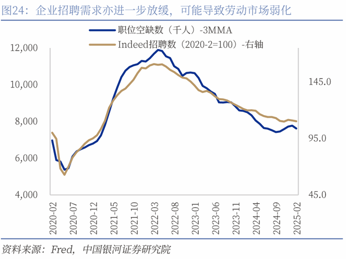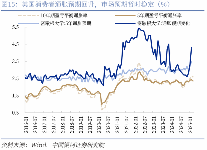 尽管短期通胀可能回升,短期通胀预期也在提升,但关税和特朗普的潜在财政收缩政策反而意味着更长期的通缩风险。首先,一次性加征的关税对通胀同比增速影响只有12个月,而每年持续加征关税近乎不可能;鲍威尔在3月的FOMC会议答记者问中也透露他认为关税通胀是暂时的,虽然短期通胀预期抬升,但中长期消费者和交易者的通胀预期整体仍然稳定,各方测算也并不指向实际通胀中枢的抬升。其次,普遍性关税是对总需求的打击:价格上涨后,企业短期的盈利将下降,这不利于进一步的投资和雇佣行为,且企业预期不论从制造业PMI,地方联储调查投资预期,还是招聘计划和职位空缺数等都有明显的下滑。从居民支出角度来看,如果薪资跟随价格上行,那么“薪资-价格螺旋”可能导致美联储维持紧缩,进而打击经济;而更可能的情况是工资作为滞后变量无法及时跟随价格调整,那么在价格上行但居民超额储蓄早已消耗殆尽的情况下,消费可能受到进一步的压制,这也是2月PCE服务支出增速进一步放缓所警示的。最后,疫情后的美国经济例外论的核心支撑主要为并不紧张的流动性、持续扩张的财政和大量涌入的(非法)移民,而特朗普目前仍在坚持希望缩减财政支出和减少移民流入,这也是总需求层面的压制。总而言之,关税导致的通胀暂时性回升在更长期可能反而是通缩风险。
