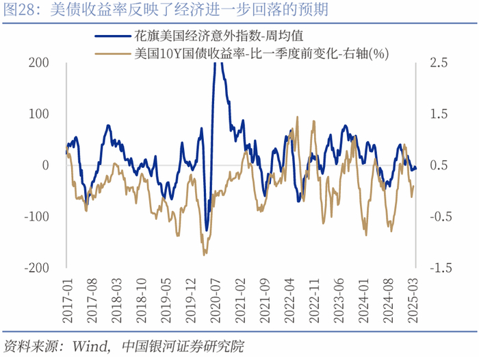 美债方面,10年期美债收益率向下突破4%的动力可能强于回升至4.5%上方的力量。上行力量主要来自于短期无法证伪的“再通胀”预期,即无法排除交易者在CPI和PCE通胀暂时性回升后交易货币政策收紧的风险,但目前看市场对此担忧并不强。从更长的视角来看,关税更容易成为通缩风险,这意味着美债收益率的中枢最终可能下移。此外,特朗普政府所坚持的削减赤字和控制移民政策短期均不利于经济增长,美国2025年Q1的GDP增速即使剔除黄金进口的影响也已经处于轻微负增长的状态,而这一不佳的表现还尚未体现关税和政府裁员的后续冲击。因此综合考虑,10年期美债收益率在特朗普坚持当前政策的情况下,中枢将降至4%下方。