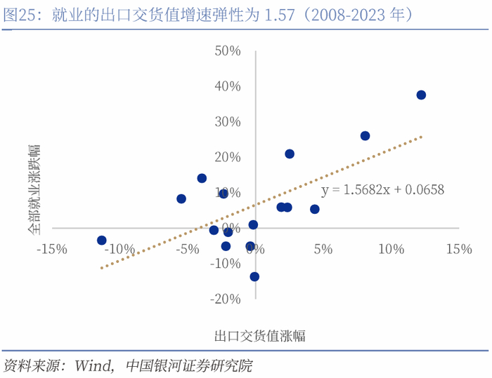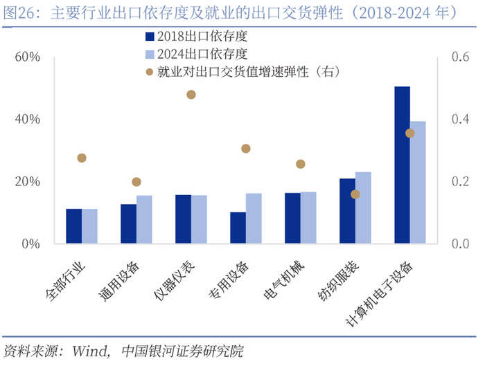 其次,美国关税政策对中国不同行业的出口依存度与就业影响呈现分化特征。若以2018年以来的数据测算,全部就业对出口交货值的弹性则降至0.28,一方面说明了金融危机后我国经济结构转型的变化,另一方面也反映在经历特朗普1.0时代关税冲击后我国出口结构调整的变化。具体来看,计算机电子行业出口依存度从2018年的51%大幅降至2024年的39%,但其就业弹性仍高达0.36,表明该行业兼具技术密集与劳动密集双重属性,短期内就业风险突出;仪器仪表行业出口依存度保持16%不变,但就业弹性达0.48,为全行业最高,凸显其高度依赖出口订单稳定性;专用设备行业出口依存度从10%跃升至16%,就业弹性0.31,显示其通过技术升级(如高端机床)部分抵消上一轮关税冲击;纺织服装行业出口依存度虽升至23%,就业弹性仅0.16,为主要行业最低,主因自动化替代与低端产能外迁。