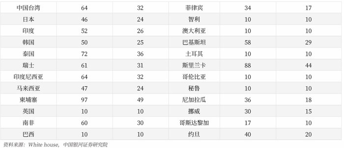 中国此次关税被影响最大的国家,此次被额外加征34%的关税。目前面临的总关税有301条款税率+20%因芬太尼产生的关税+34%对等关税,总计约65%,关税或被增加1500亿美元左右。