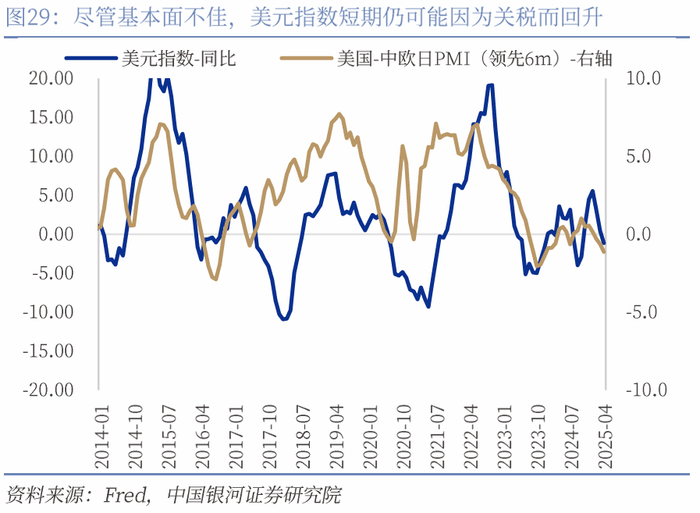 美元方面,美国的名义经济增速和利率水平依然是核心,这也意味着特朗普的关税、政府精简、移民、减税等相关政策将主导美元的潜在走势。短期来看,在特朗普进一步执意推动对等关税落地的情况下,美元指数在已经部分计入经济下行预期、美联储短期谨慎、通胀存在短暂上行风险的情况下下滑幅度下仍需要经济数据进一步萎缩,才能更顺畅下行。更长期来看,关税对经济的造成的潜在压制和通缩力量,叠加美国对于欧洲防务淡漠引发欧洲的财政扩张支撑欧元,都可能使美元进一步走弱;如果关税引发各国反制,美元指数下半年有低于100的可能。