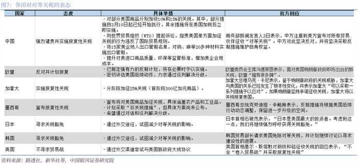 日韩态度也相对柔软。日韩的态度均表现为希望通过外交途径获得关税豁免。日本贸易和工业部长武藤洋二称这些关税“令人极为遗憾”,并表示东京仍在试图说服特朗普政府重新考虑。日本首相石破茂4月1日表示,“日本是美国最大的投资者。考虑到这一点,我们将继续强烈呼吁获得关税豁免”,“如果认为有必要亲自去一趟美国,我会毫不犹豫地去做”。 韩国代理总统韩德洙在经济和安全战略工作组紧急会议上指示高级官员紧急应对危机,表示 “全球关税战现实临近,形势十分严峻,政府必须竭尽全力克服这场贸易危机。”韩国贸易部长3月15日请求美国免除对等关税,并计划继续讨论以寻求建设性的进展。