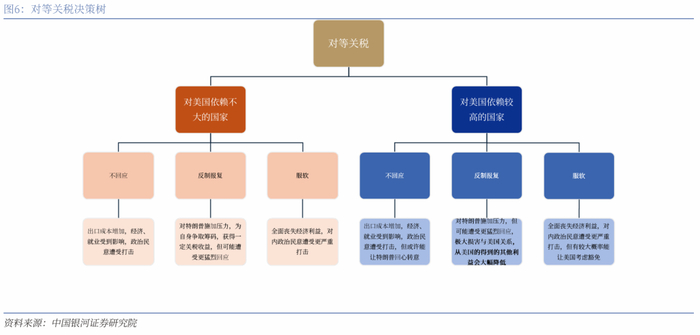 我们将被征收对等关税国家的决策简化为三部分,分别是不回应、反制报复以及服软。对国家的影响对于不依赖美国的国家,直接报复是对自身经济和政治的最优解, 虽然双方都会遭受严重经济损失,但一方面报复可以向美国施加压力,将特朗普推回谈判桌,同时获得小部分税收收入;另一方面,对国内和国际上的政治压力会减轻,或能通过与别国斡旋得到额外收益。而对于高度依赖美国的国家,包括经济、政治、军事、金融依赖等等,服软顺从可能是其最优解。像日韩菲律宾等高度依附于美国的盟友,顺从特朗普既不伤害与美国同盟关系,又或许能让特朗普回心转意。而反制则不但会从关税上得到更猛烈共计,其他美国提供的军事,金融和政治援助也可能被削弱。