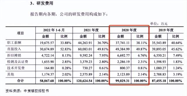 根据披露,中策橡胶研发费用主要包括直接投入、研发人员薪酬、研发设备折旧摊销等。其中,中策橡胶在2020年度的研发费用合计为9.9029亿元,包括职工薪酬3.7741亿元、直接投入4.9384亿元、折旧摊销6692.77万元、检测及认证费2286.19万元等构成的。