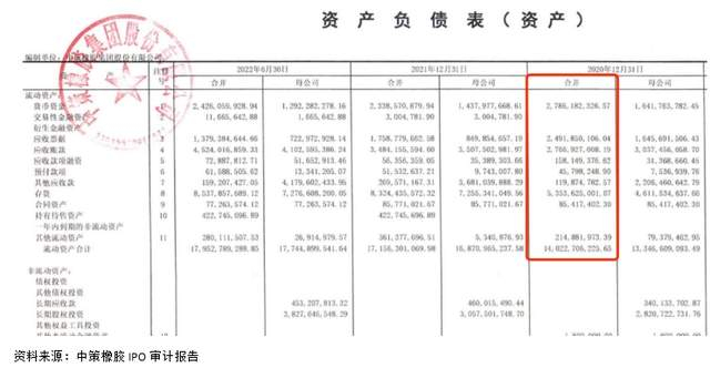 同样是由天健会计事务所和同样的审计师,而在《中策橡胶集团有限公司2019年至2022年6月审计报告》中,中策橡胶在2020年度合并资产负债表中显示:货币资金为27.8618亿元;应收票据为24.9185亿元;应收账款为27.6692亿元;应收款项融资为1.5814亿元;预付款项为4579.82万元;其他应收款为1.1987亿元。