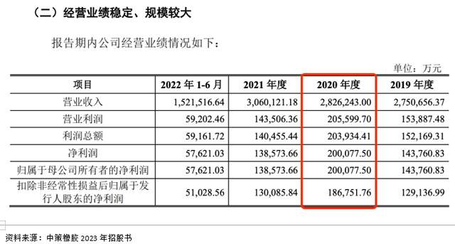 根据2023年3月1日的招股说明书披露,中策橡胶在2019年至2021年度间分别实现营业收入分别为2,750,656.37万元、2,826,243.00万元、3,060,121.18 万元;实现的净利润分别为 143,760.83 万元、200,077.50 万元、138,573.66 万元。
