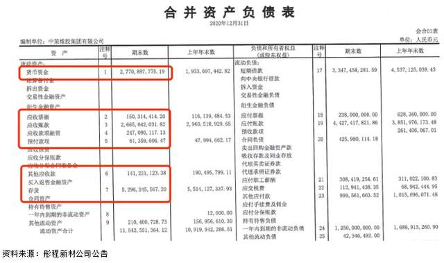 在《彤程新材:中策橡胶集团有限公司2020年审计报告》中,中策橡胶在2020年度合并资产负债表中显示:货币资金为27.7088亿元;应收票据为1.5031亿元;应收账款为26.6504亿元;应收款项融资为2.4708亿元;预付款项为6135.96万元;其他应收款为1.4122亿元。