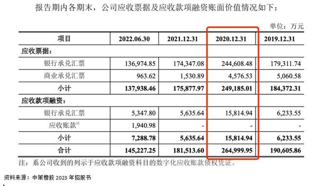 而在2023年招股书披露显示,中策橡胶在2020年度的应收票据账面价值为24.9185亿元,也就是说,2023年招股书披露的数据与《彤程新材:中策橡胶集团有限公司2020年审计报告》中的数据前后相差超过了23亿元。