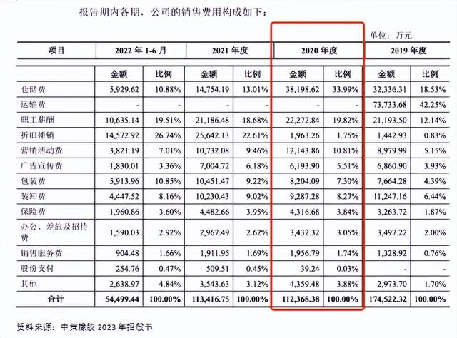 其中,中策橡胶招股书中披露到2020年度的销售费用中,占比最高的是由仓储费、职工薪酬、营销活动费、装卸费、包装费、广告宣传费等项目构成的,分别实现金额为3.8198亿元、2.2272亿元、1.2143亿元、9287.28万元、8204.09万元和6193.90万元。