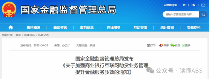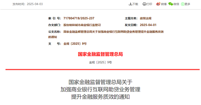 4月3日,国家金融监督管理总局发布《国家金融监督管理总局关于加强商业银行互联网助贷业务管理提升金融服务质效的通知》(以下简称《通知》),自2025年10月1日起施行。