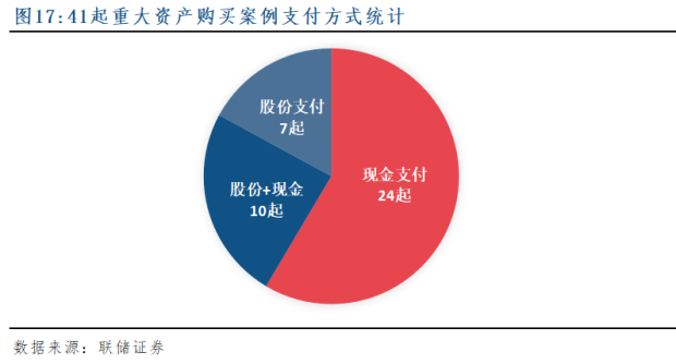 从支付方式看,41起重大资产购买案例中,24起交易采用全现金支付,占比58.54%;10起交易采用“股份+现金”方式支付,占比24.39%;剩余7起交易采用股份支付,占比17.07%。