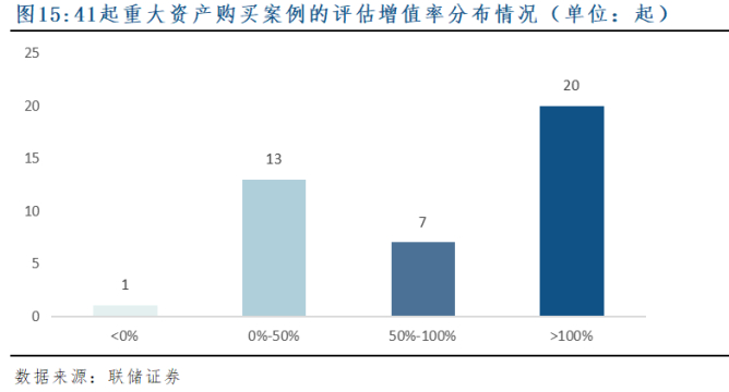 41起重大资产购买案例中,标的资产评估增值率超过100%的有20起交易,占比48.78%;评估增值率处于区间50%-100%、0-50%的分别有7起、13起交易,评估增值率低于0即发生评估减值情形的有1起交易。