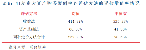 从评估增值率观察,41起重大资产购买案例合计平均评估增值率为259.22%,选用收益法、资产基础法的平均增值率分别为414.87%、60.35%;41起重大资产购买案例合计评估增值率中位数为98.56%,选用收益法、资产基础法的评估增值率中位数分别为225.23%、41.30%。