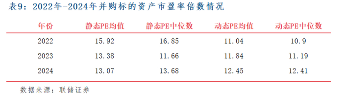 在本报告统计的2022-2024年完成的41起重大资产购买样本中,静态市盈率范围为5.8-26.79倍,均值、中位数分别为14.02倍、13.33倍;动态市盈率范围为5.77-16.68倍,均值、中位数分别为11.59倍、10.91倍。