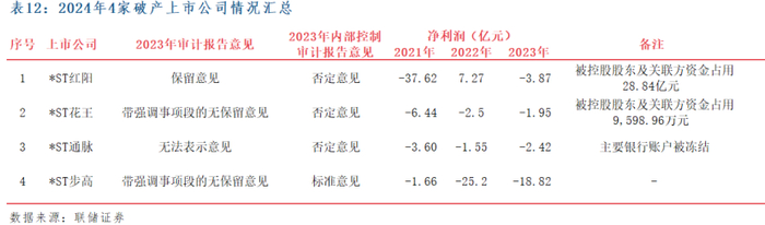 我们进一步发现,上述11家上市公司中有7家出现严重的资不抵债,需要通过破产重整将净资产回正,挽救退市危机。例如*ST合泰,截至2023年末的归母净资产为-65.17亿元,其重整计划于2024年12月31日执行完毕,根据上市公司近日发布的业绩预告,2024年末其归母净资产预计达到12-18亿元。