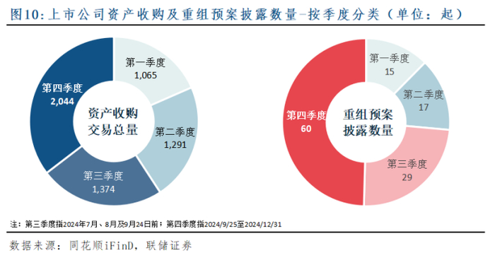 924并购新政后,上市公司开展各类并购交易数量为2,044起,占全年总数5,774起的比例为35.4%。其中,上市公司披露重组预案(指所有发行股份购买资产的交易以及构成重大的资产收购现金交易)数量变化更为明显,并购新政后共披露了60起此类交易,占2024年全年同口径的121起交易的一半;上市公司披露重组预案数量从之前平均每个月6单,激增至并购新政后平均每个月20单左右。上述指标均指向并购新政后A股并购市场快速升温,市场活跃度明显增强。
