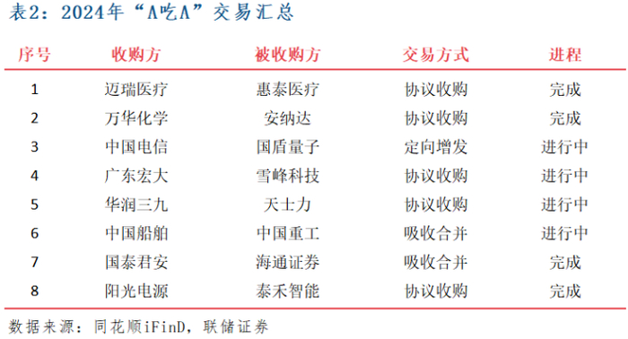 我们将A股上市公司通过市场化方式收购另一家A股上市公司控股权交易简称为“A吃A”。2024年A股市场共披露8起“A吃A”交易,相较2023年的仅2起有所回温。其中,迈瑞医疗以超过30%的溢价率协议收购惠泰医疗控制权,成为科创板开市以来首例“A吃A”交易;中国船舶吸收合并中国重工、国泰君安吸收合并海通证券成为2024年A股两笔并购规模最大的交易。