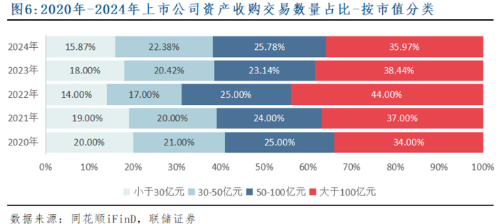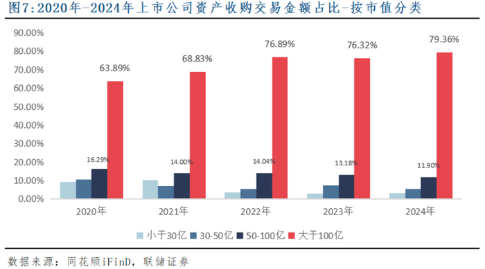 从交易金额上看,市值百亿以上的上市公司全年合计收购规模为1.36万亿元,占上市公司收购资产总规模的79.36%,相较2023年同比的76.32%有进一步提高;市值50-100亿元的上市公司合计收购规模为2,046.62亿元,占上市公司收购资产总规模的11.90%。