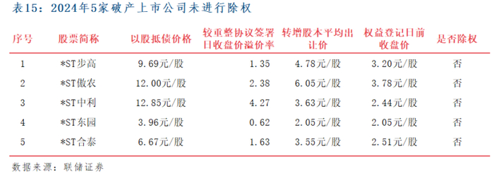 2024年11家被法院裁定受理重整且已执行完毕的上市公司中,有5家上市公司没有进行除权,虽然是符合现行的“如权益调整方案约定的转增股份价格高于上市公司股票价格的,可以不对上市公司股票作除权(息)处理”这一规定,但如果结合这5家的以股抵债价格就不难发现,其实是通过大幅度虚增以股抵债价格方式,使得转增股份的平均价格高于该公司停牌前的股票价格,从而实现了资本公积转增但股价不除权的目标。