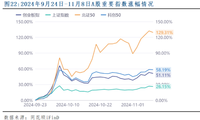 我们认为,回购增持再贷款政策工具没有达到预期的主要原因在于2024年九月底以后的二级市场噪音太大,让新政策工具的“魅力”无法充分展示出来。首先,大盘指数从2024年9月24日起步,市场交易量急剧放大,且各板块走势分化严重,至2024年11月8日,北证50指数涨幅129.31%,科创50指数涨幅58.19%,代表大盘蓝筹的上证指数涨幅仅26.15%;其次,部分重组题材的个股连续涨停,如双成药业、松发股份等股票的最大涨幅分别达到8倍、4倍(请参考本报告第二章“924并购新政的喜与忧”)。在日进斗金的狂热气氛中,不管是散户投资人还是机构投资者都对新政策工具透露出来的“和风细雨”视而不见;既然二级市场投资者不关注回购增持股票,大股东或上市公司管理层也就没有兴趣继续申请专项贷款了,新政策工具就这样“淹没在一片噪音之中”,没有形成有效的正反馈效应。
