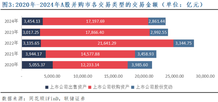 从各类型的交易规模来看,2024年,A股上市公司披露交易金额的资产出售规模共计3,454.13亿元,较上年同期增长14.48%;A股上市公司披露交易金额的资产收购规模共计1.72万亿元,较上年同期下滑3.76%;A股上市公司披露交易金额的股份变动规模共计2,861.44亿元,较上年同期下滑4.38%。