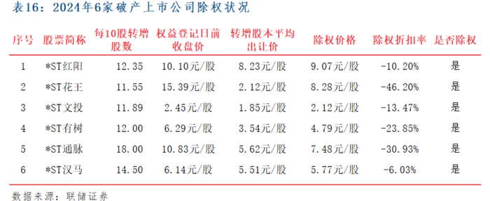 其余6家上市公司重整后虽然对股价进行了除权,但其除权比例与转增股本的比例相比差异悬殊,除权非常不充分。这6家除权的上市公司除权价格的平均折扣率仅为20%左右,相较于转增股数平均为每10股转增13.38股,除权比例微不足道。